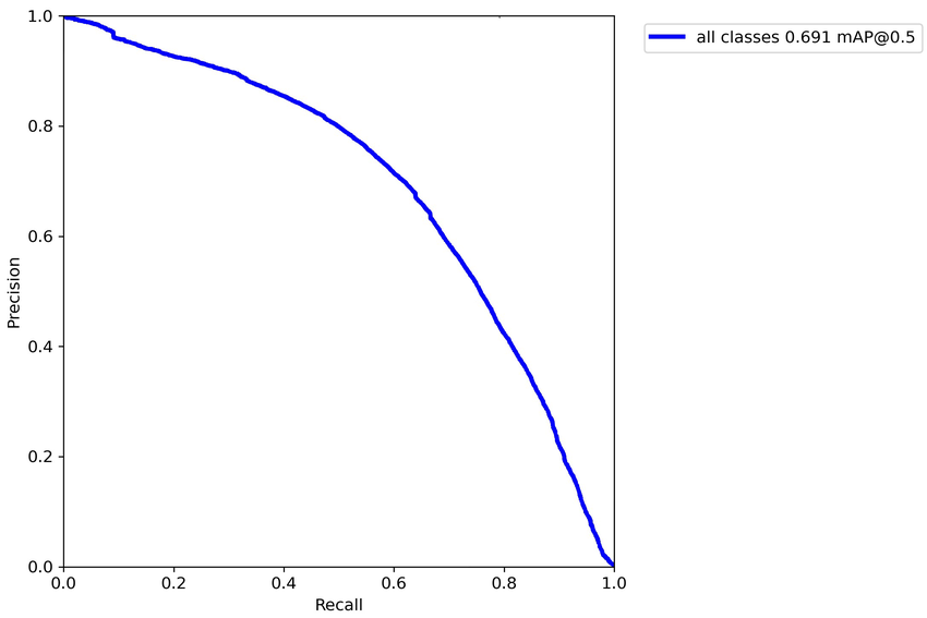 The above graph shows the precision (the ratio of correct identifications to the total amount of identifications) versus the recall (the ratio of the correct identifications to the total number of correct identifications). So precision measures how correct the model's predictions are, and